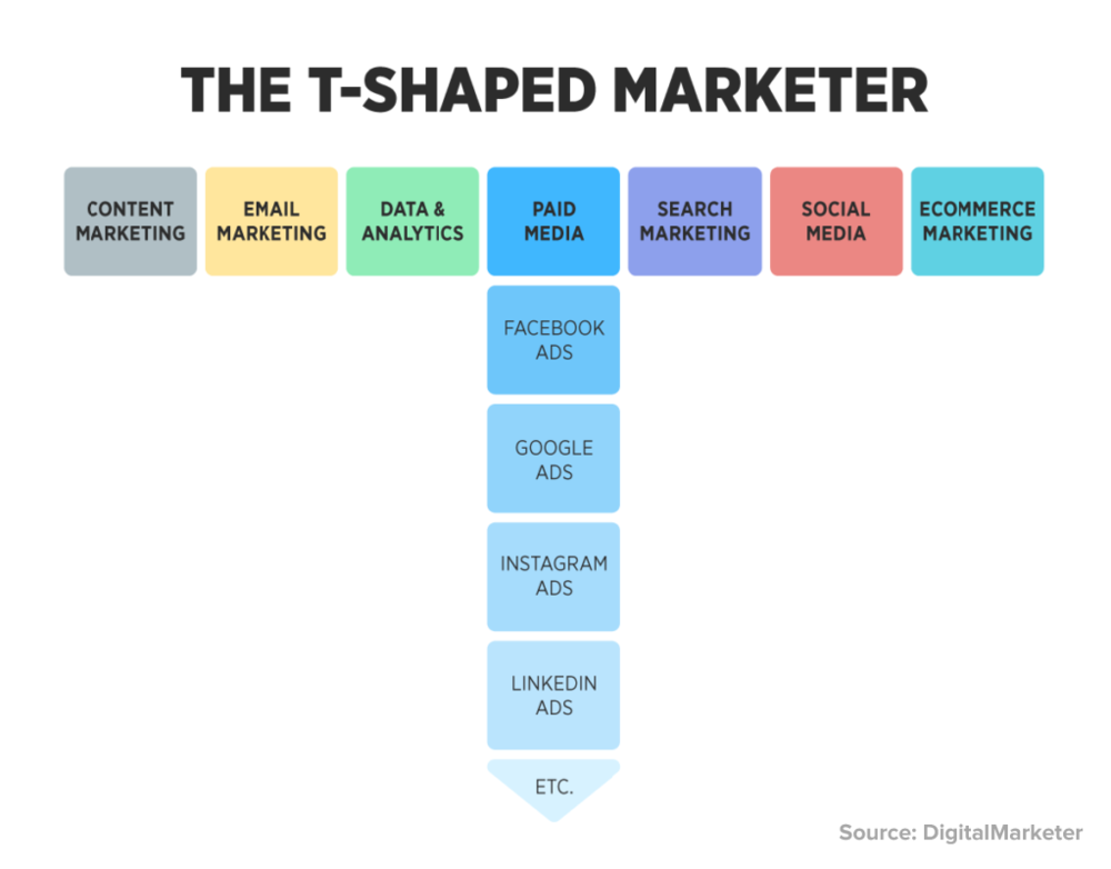 Here is a visual from Digital Marketer that helps explain the classic idea of a T-shaped marketer. Generally, the idea is that most marketers won’t have deep expertise in every single area of marketing. Rather, they usually specialize and have more extensive knowledge in one (or two, or as many as three) areas of marketing. As you can see, this version of the T-shaped model relates mostly to web marketing.